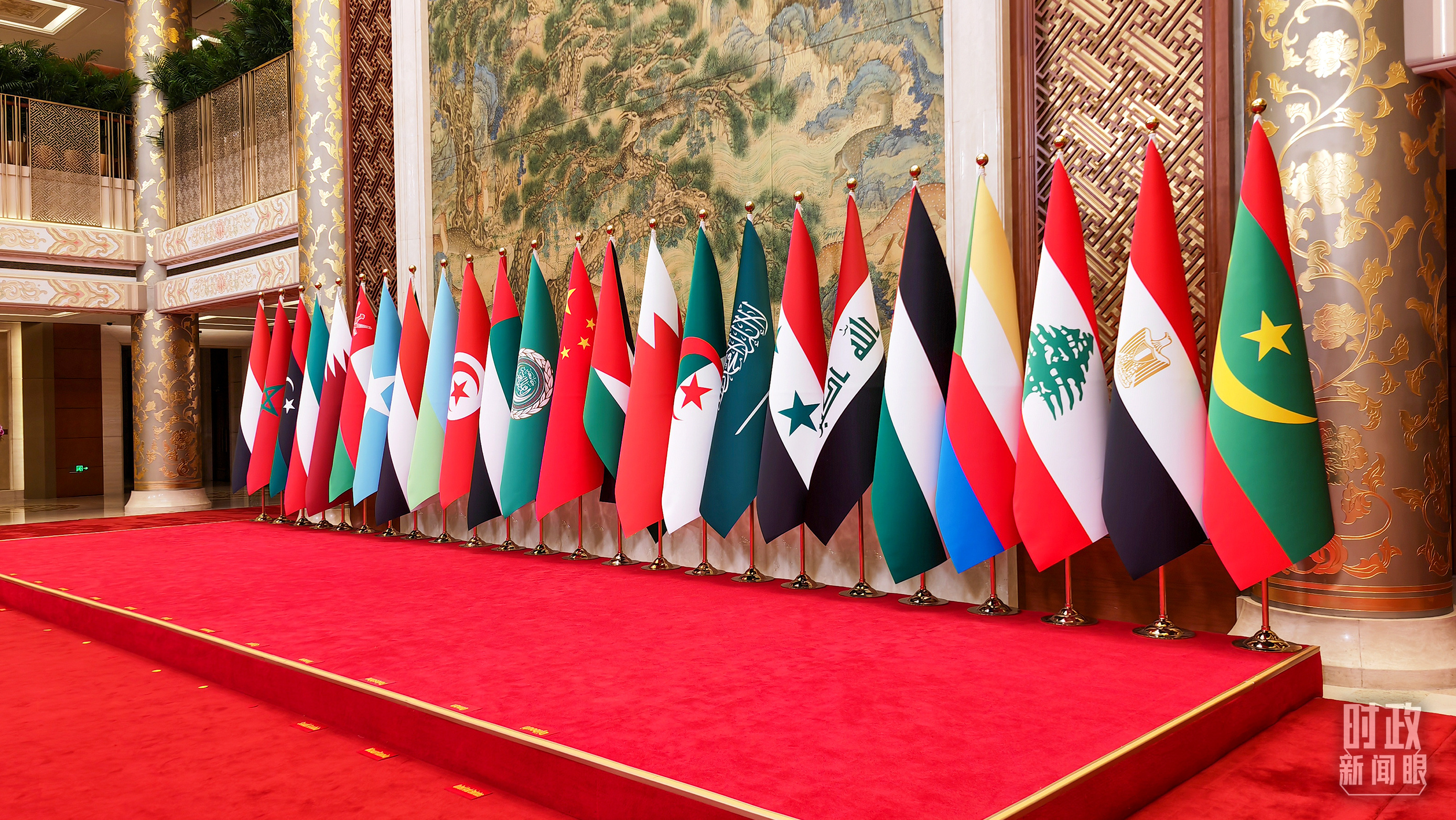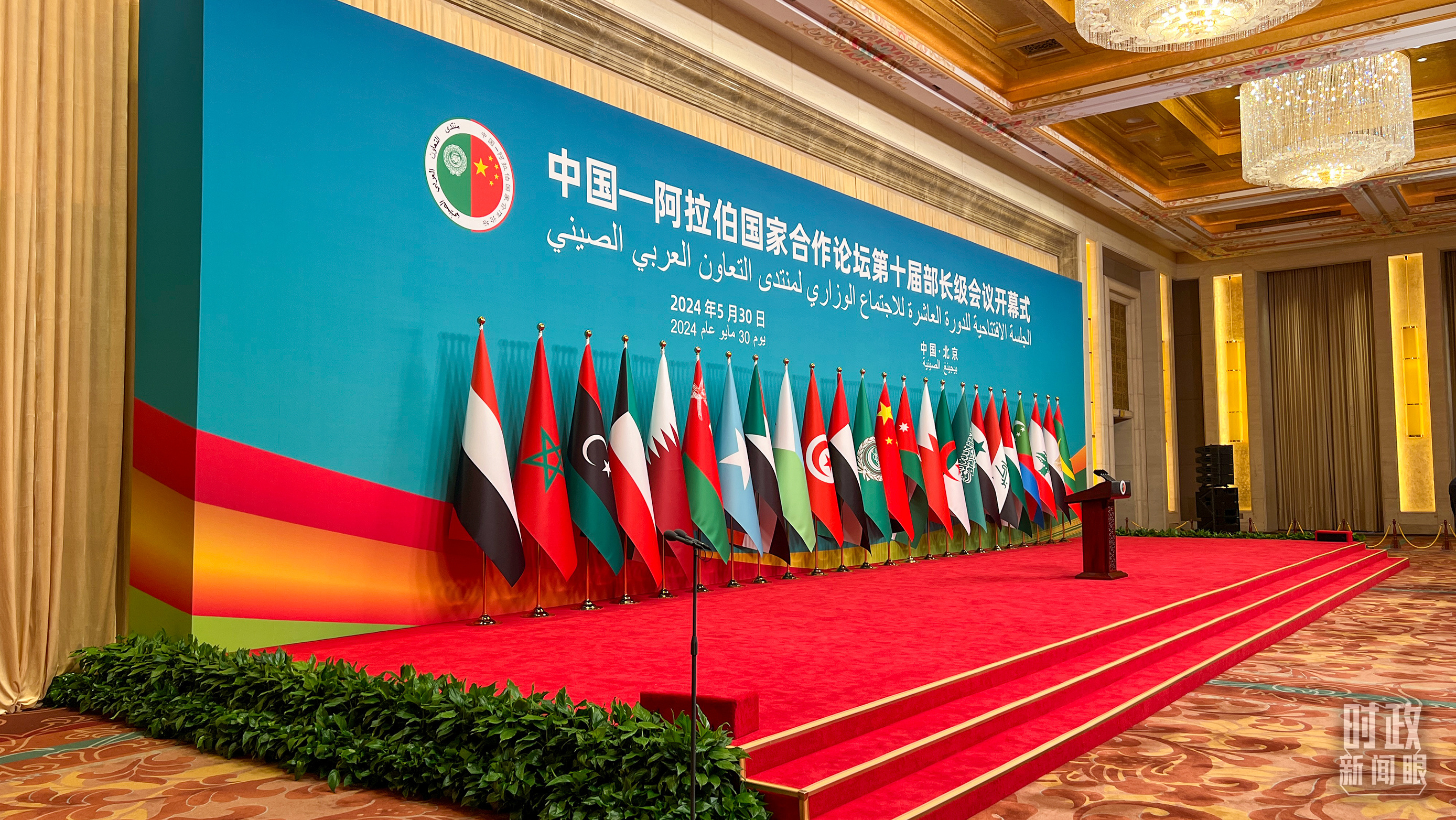 5月30日上午,北京钓鱼台芳华苑内,中国和22个阿拉伯国家国旗以及阿盟旗帜相映成辉。中阿合作论坛第十届部长级会议开幕式在这里举行。