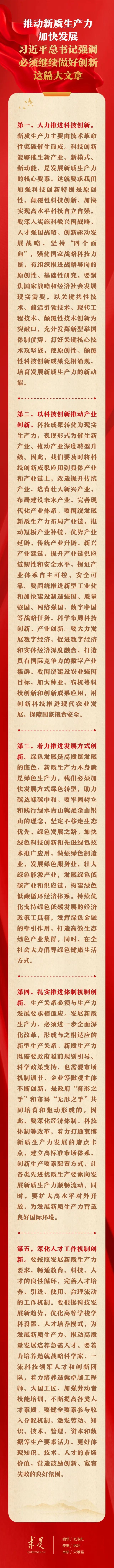 “新质生产力的显著特点是创新,既包括技术和业态模式层面的创新,也包括管理和制度层面的创新。必须继续做好创新这篇大文章,推动新质生产力加快发展。”
