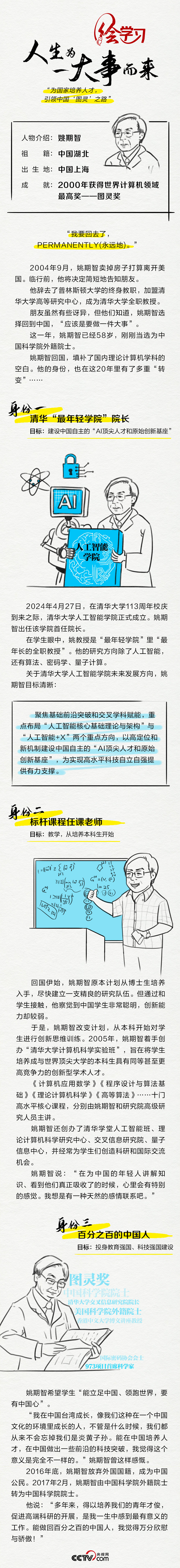 作为一名计算机科学专家,姚期智是图灵奖创立以来首位亚裔获奖者,也是世界现代密码学基础的奠基人之一。2004年,姚期智辞去美国普林斯顿大学终身教职,回国到清华大学全职任教。他曾说,“人生为一大事而来”。这件大事,就是“为国家培养人才,引领中国‘图灵’之路”。央视网《天天学习》栏目推出手绘长图,为您讲述姚期智将爱国之情化为报国之行的奋斗故事。