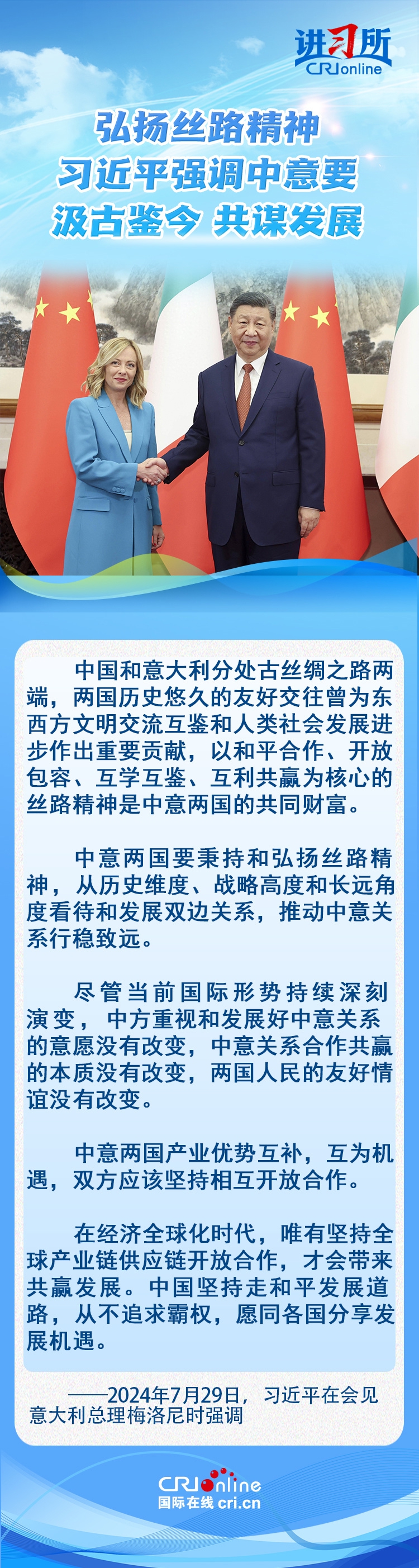 7月29日,中国国家主席习近平在北京会见来华进行正式访问的意大利总理梅洛尼。习近平指出,今年是中意建立全面战略伙伴关系20周年和马可·波罗逝世700周年,双方汲古鉴今、共谋发展面临重要机遇。