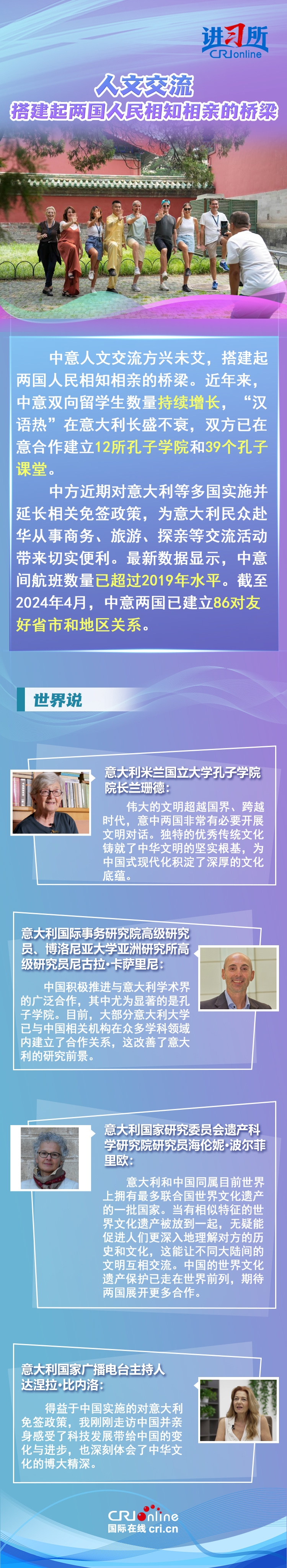 梅洛尼表示,中国对意大利而言是一个极为重要的经贸和文化合作伙伴。意大利各界人士认为,中意并肩同行会创造更多的经济奇迹,同时两国非常有必要开展文明对话,期待未来两国展开更多领域合作,开启全面战略伙伴关系新阶段。