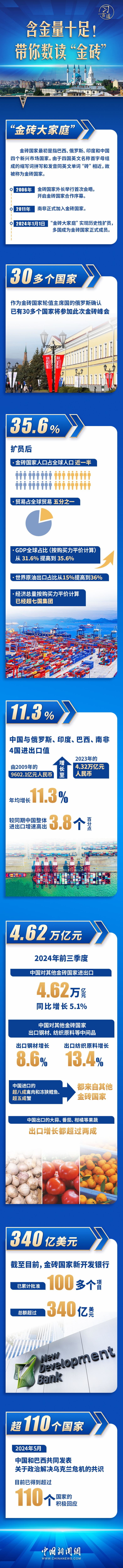 10月22日至24日,金砖国家领导人第十六次会晤将在俄罗斯喀山举行,这是金砖扩员后的首次领导人会晤。扩员后的“大金砖”含金量有多高?这些数字带你看懂——