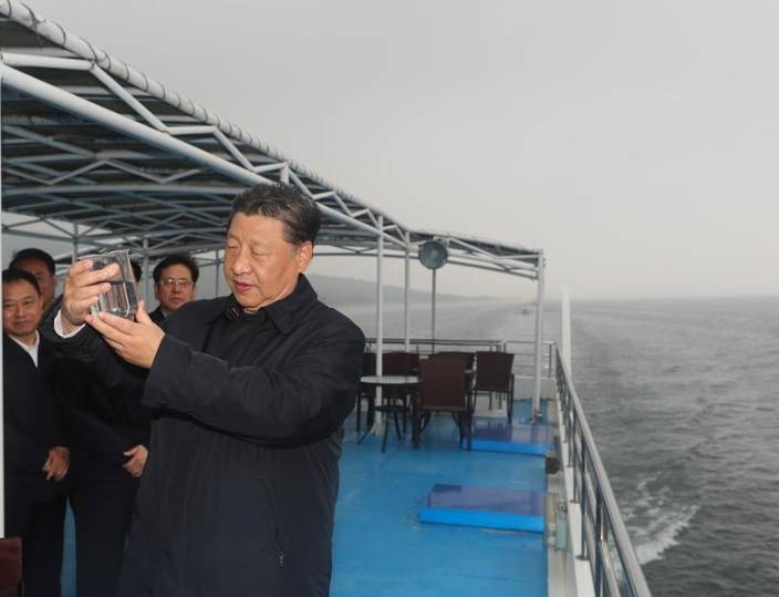 在乘船考察时,总书记端起一杯新打上来的水库水,迎着光看了又看,笑着说:“‘水龙头’水质不错!”