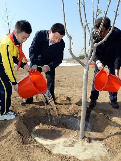 2014年4月,南水北调中线一期工程通水前夕,配套工程北京团城湖调节池迎来了种树人习近平。在那里,他接连种下了6棵树,植树结束,还向工程负责人了解了南水北调水源的水质与保护等问题。