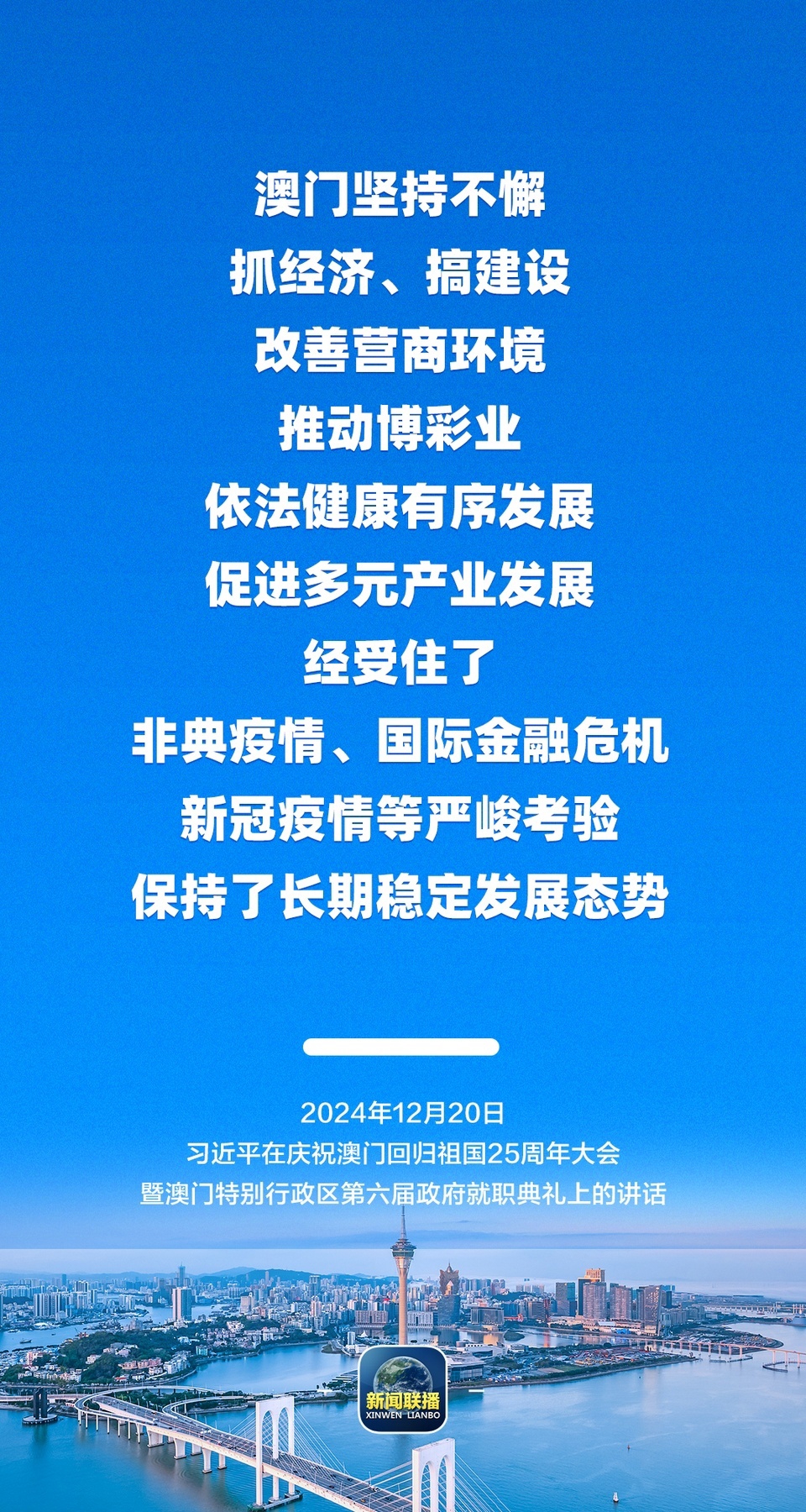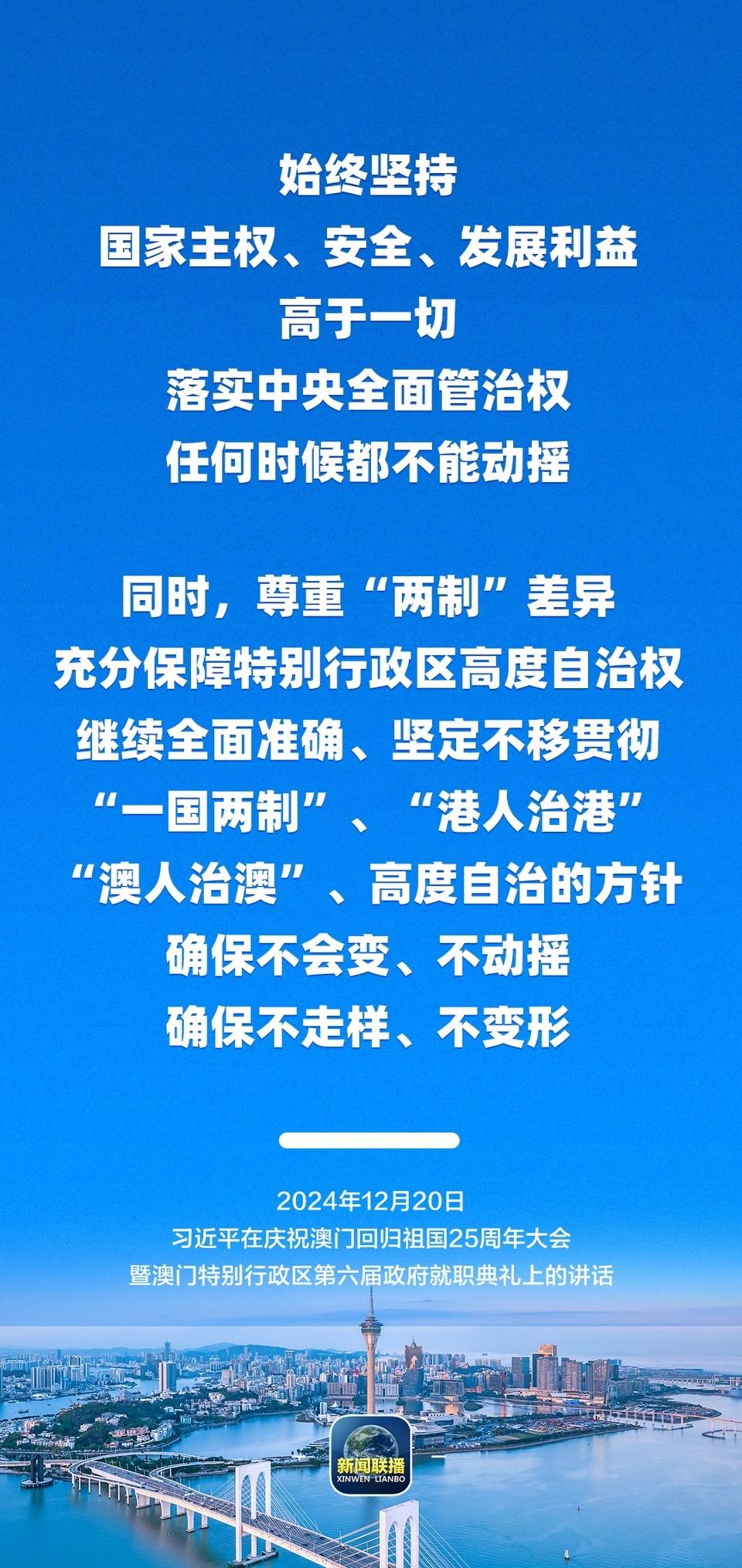 习近平强调,只要全面准确、坚定不移贯彻“一国两制”方针,有特别行政区政府和社会各界共同努力,有伟大祖国作坚强后盾,澳门一定能打开发展新天地、不断创造新辉煌,一定能为以中国式现代化全面推进强国建设、民族复兴伟业作出更大贡献。