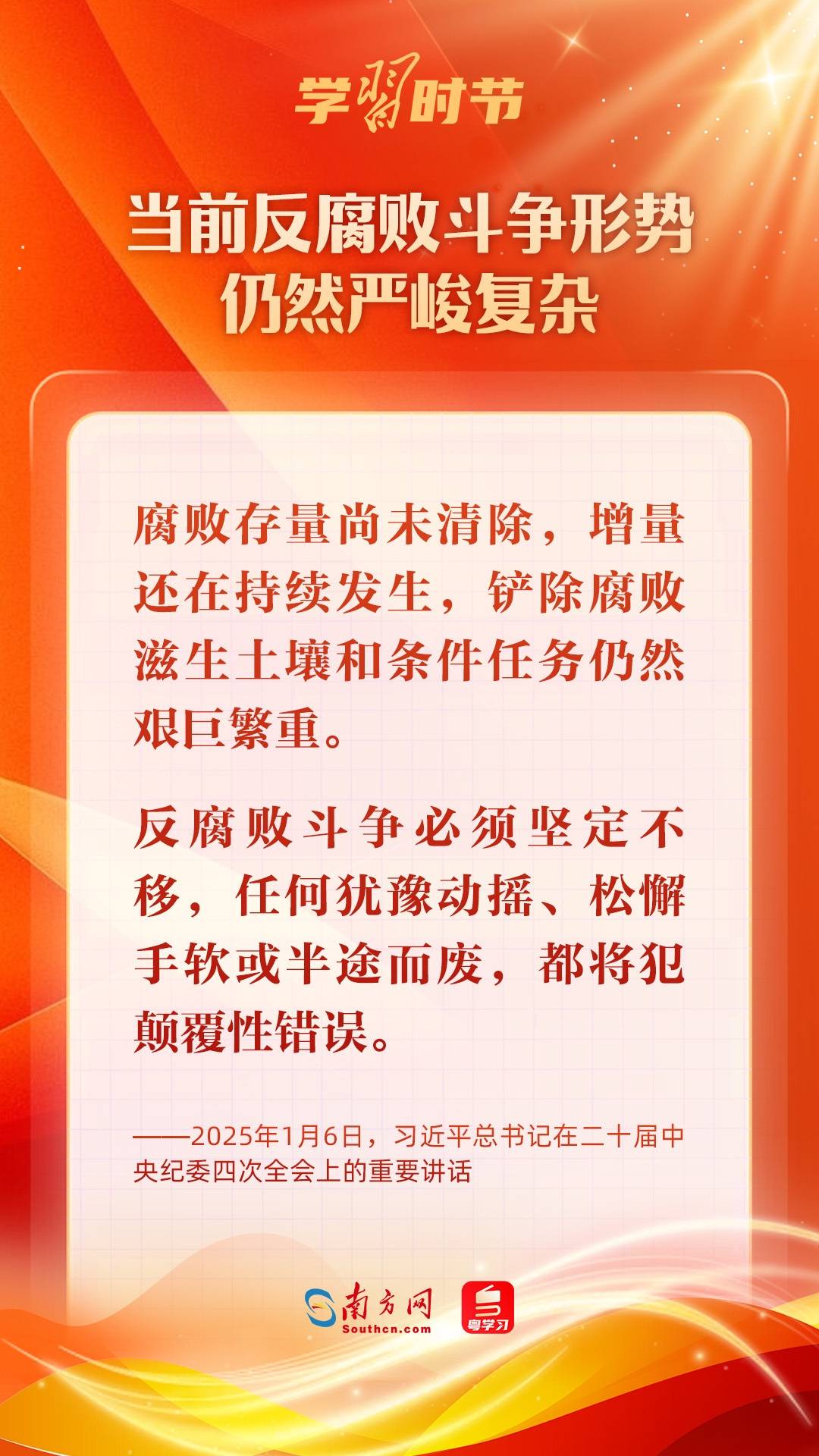 1月6日,中共中央总书记、国家主席、中央军委主席习近平在中国共产党第二十届中央纪律检查委员会第四次全体会议上发表重要讲话,深刻把握反腐败斗争基本规律,深刻分析当前反腐败斗争形势,对坚决打好反腐败斗争攻坚战、持久战、总体战提出明确要求,对深入推进全面从严治党作出战略部署。