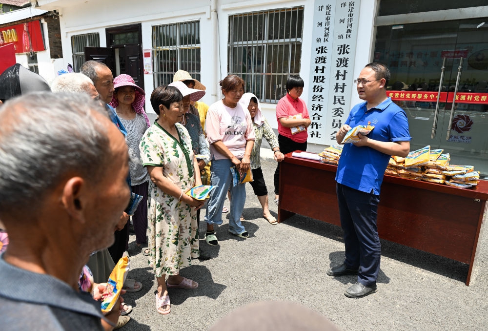 2024年6月12日,在江苏省宿迁市洋河新区张渡村党群服务中心,村支部书记陈磊(右一)为村民讲解高粱种植知识。张渡村因地制宜,引导村民种植高粱,为当地酒厂提供原料,增加村民收入。新华社记者 季春鹏 摄