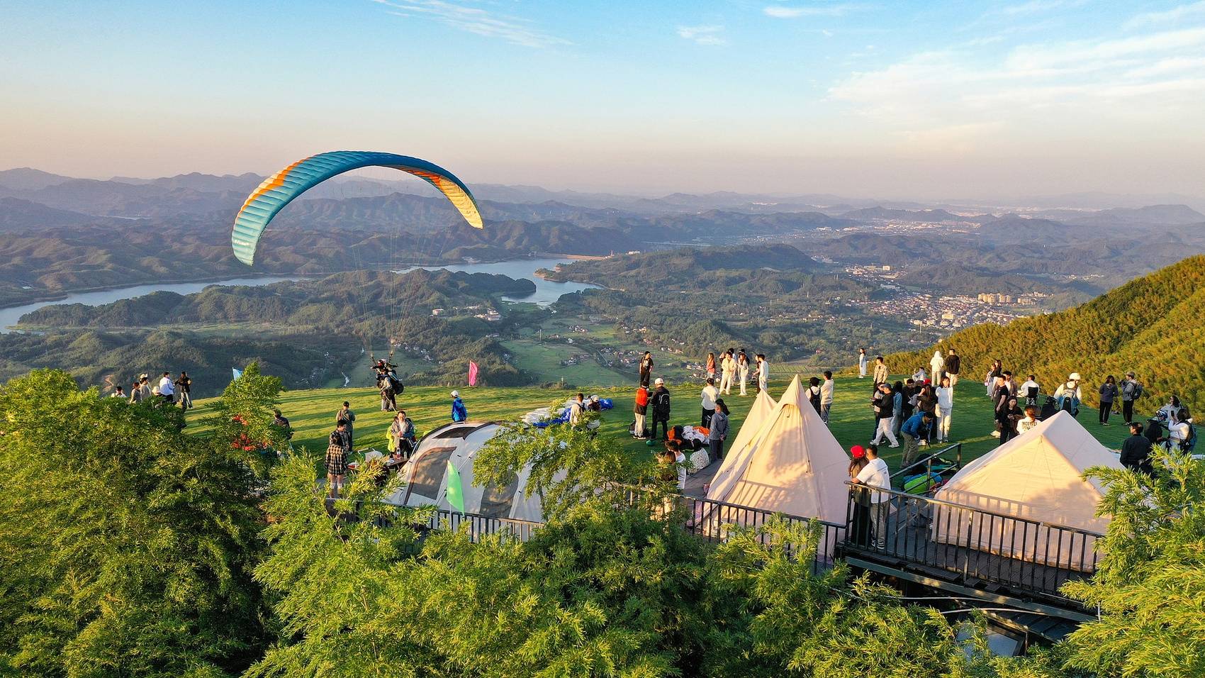 浙江安吉:游客乘坐滑翔伞领略自然风光