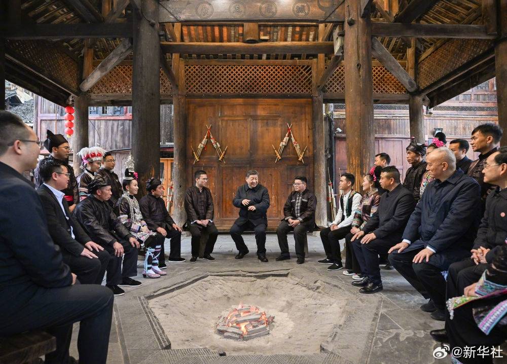 17日下午,习近平总书记来到贵州黎平县肇兴侗寨考察。在村寨的信团鼓楼,习近平同村干部和村民代表围坐在火塘边共话乡村全面振兴。大家你一言、我一语,争相向总书记讲述近年来的村寨变化和幸福生活。习近平高兴地说,从你们的讲述、你们的神情可以看出,村寨这些年欣欣向荣。现在旅游是一个很大的产业,乡村旅游如火如荼,民族地区要保留自己的特色文化,在文旅融合中更加彰显它的光彩。祝你们的日子越过越红火!