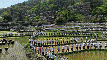 侗族群众在肇兴侗寨前载歌载舞。