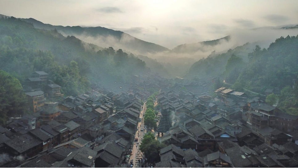 肇兴侗寨内,古朴别致的吊脚楼掩映在青山绿水间。