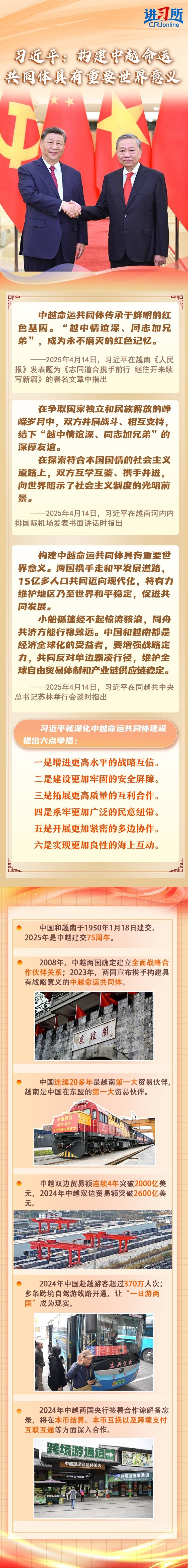 “越中情谊深、同志加兄弟”。近年来,到邻居家串门、到同志家做客,已成为中越两党两国关系的生动写照。作为志同道合、命运与共的同路人,构建具有战略意义的中越命运共同体,是双方对共谋光明未来的美好憧憬。2023年,习近平总书记访越期间提出“六个更”总体目标,为中越命运共同体立梁架柱。在此次同越共中央总书记苏林会谈中,习近平就深化中越命运共同体建设提出“六点举措”,强调“构建中越命运共同体具有重要世界意义。两国携手走和平发展道路,15亿多人口共同迈向现代化,将有力维护地区乃至世界和平稳定,促进共同发展。”