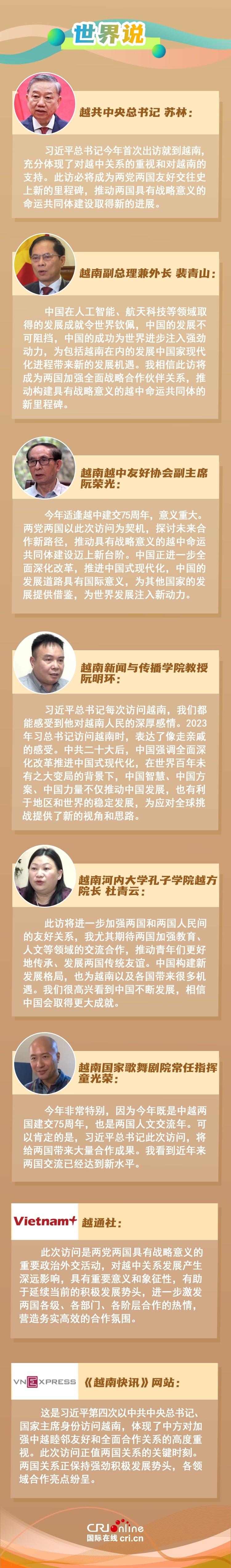 越南各界普遍认为,习近平总书记今年首次出访选定越南,充分体现了对越中关系的重视和对越南的支持,相信此访将成为两国加强全面战略合作伙伴关系,推动构建具有战略意义的越中命运共同体的新里程碑。