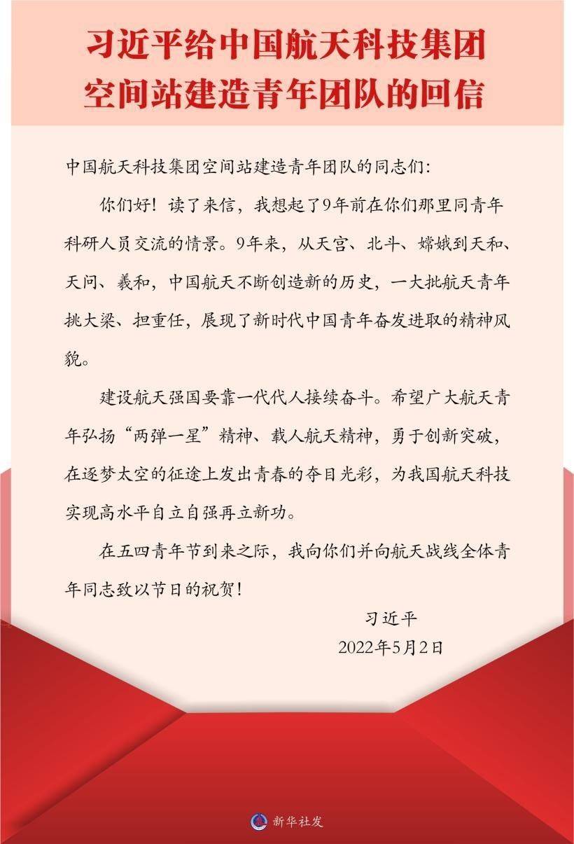习近平总书记给中国航天科技集团空间站建造青年团队的回信。新华社发