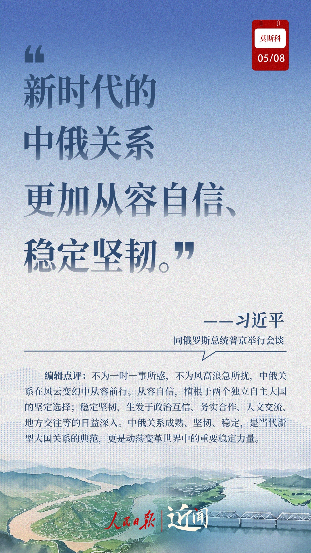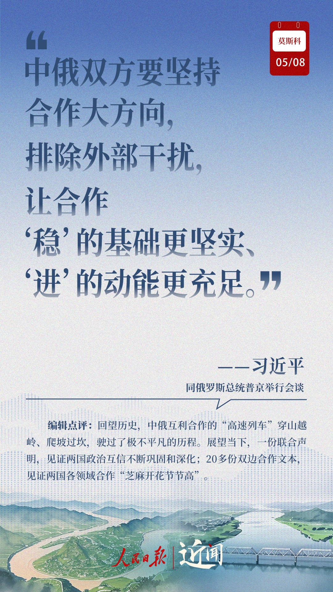 当地时间5月8日,习近平主席出席普京总统举行的欢迎仪式、小范围会谈、大范围会谈、签字和合作文本交换仪式、共见记者、茶叙,两国元首不同形式的长时间交流,引领中俄关系登高望远。