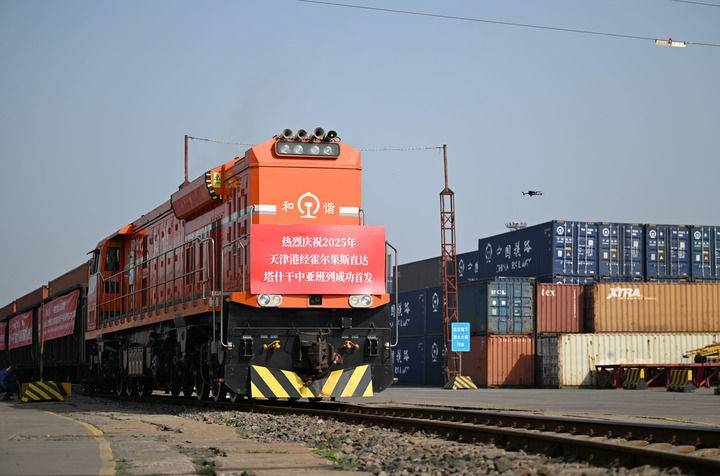 2025年5月20日,2025年首列天津港经霍尔果斯直达塔什干的中亚班列从天津港物捷三堆场发车。新华社记者 赵子硕 摄