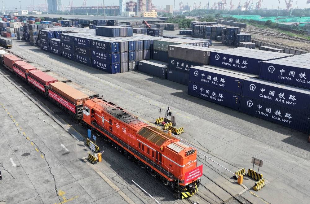 2025年5月20日,2025年首列天津港经霍尔果斯直达塔什干的中亚班列准备从天津港物捷三堆场发车(无人机照片)。新华社记者 赵子硕 摄