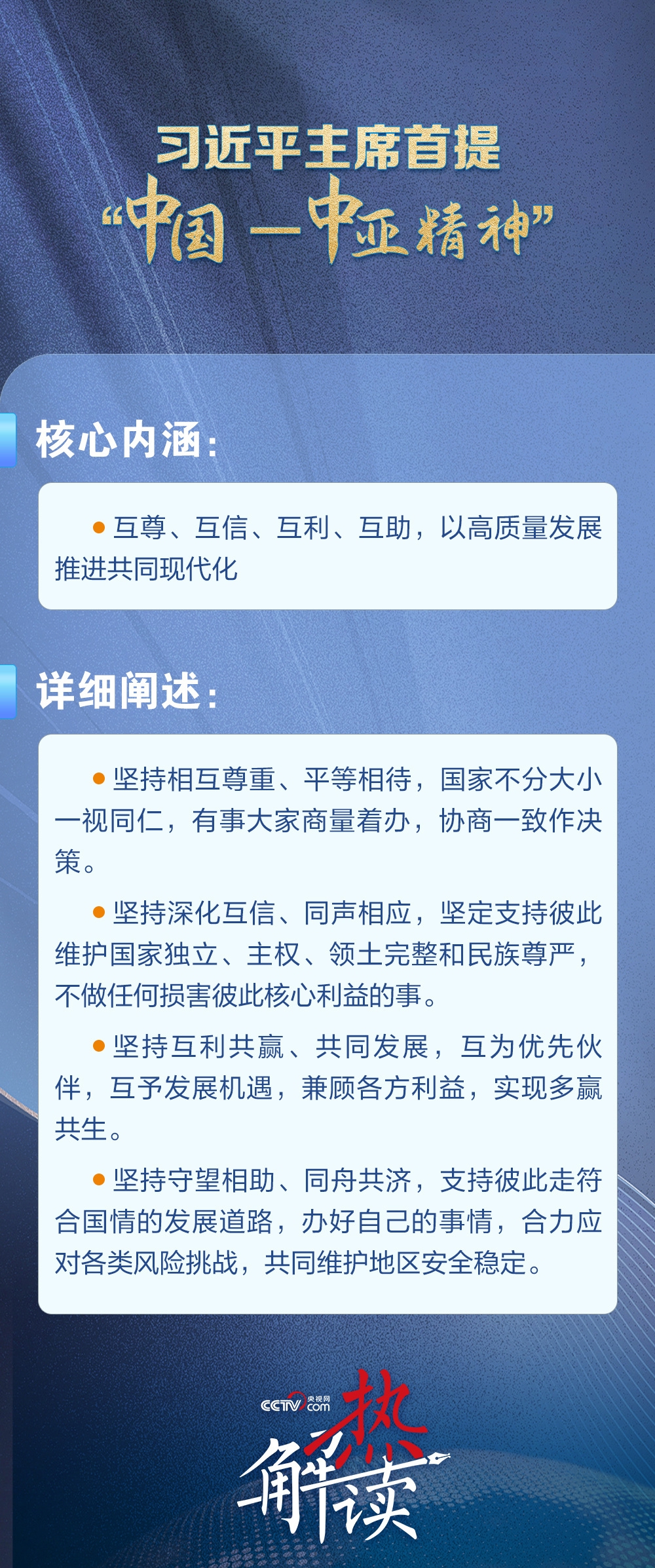 当地时间6月17日,习近平主席在哈萨克斯坦首都阿斯塔纳出席第二届中国—中亚峰会并作主旨发言,首次提出“中国—中亚精神”。