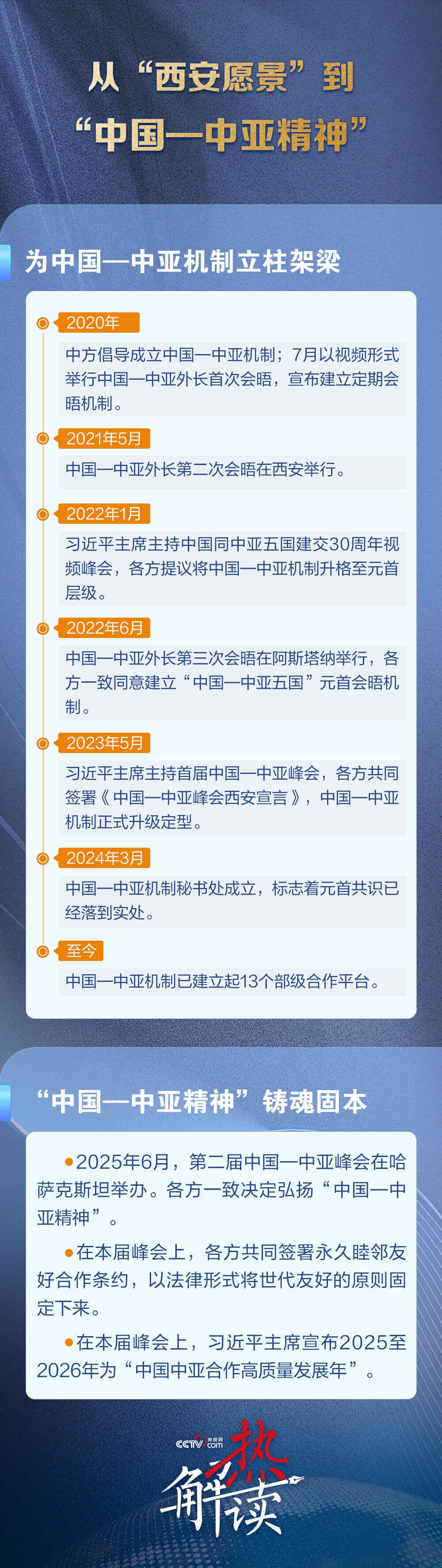 本次中国—中亚峰会期间,中国同中亚五国宣布签署共建“一带一路”、人员往来便利化、绿色矿产、贸易畅通、互联互通、工业、海关等领域12份合作文件。各方还商定2025至2026年为“中国中亚合作高质量发展年”。
