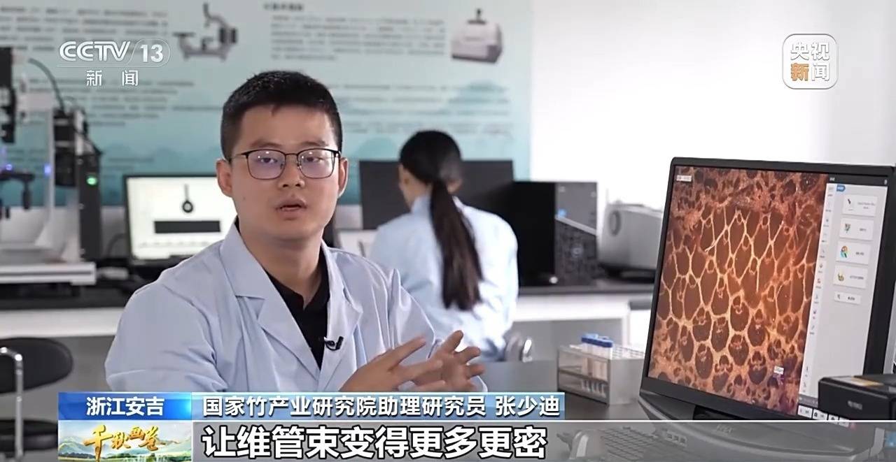 国家竹产业研究院副院长 张亚慧:这个“竹钢”的强度,是普通钢的1.5倍,但是单位肌肉力量是普通钢的4到5倍。我们让传统的竹材种植、加工业进入了新材料、生物制造这样的新领域、新赛道,附加值增加了3到5倍。