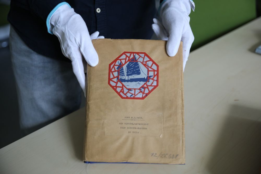 7月30日,在德国柏林的西门子历史档案馆,历史学家埃瓦尔德·布勒歇尔展示《拉贝日记》部分原件。新华社记者 杜哲宇 摄