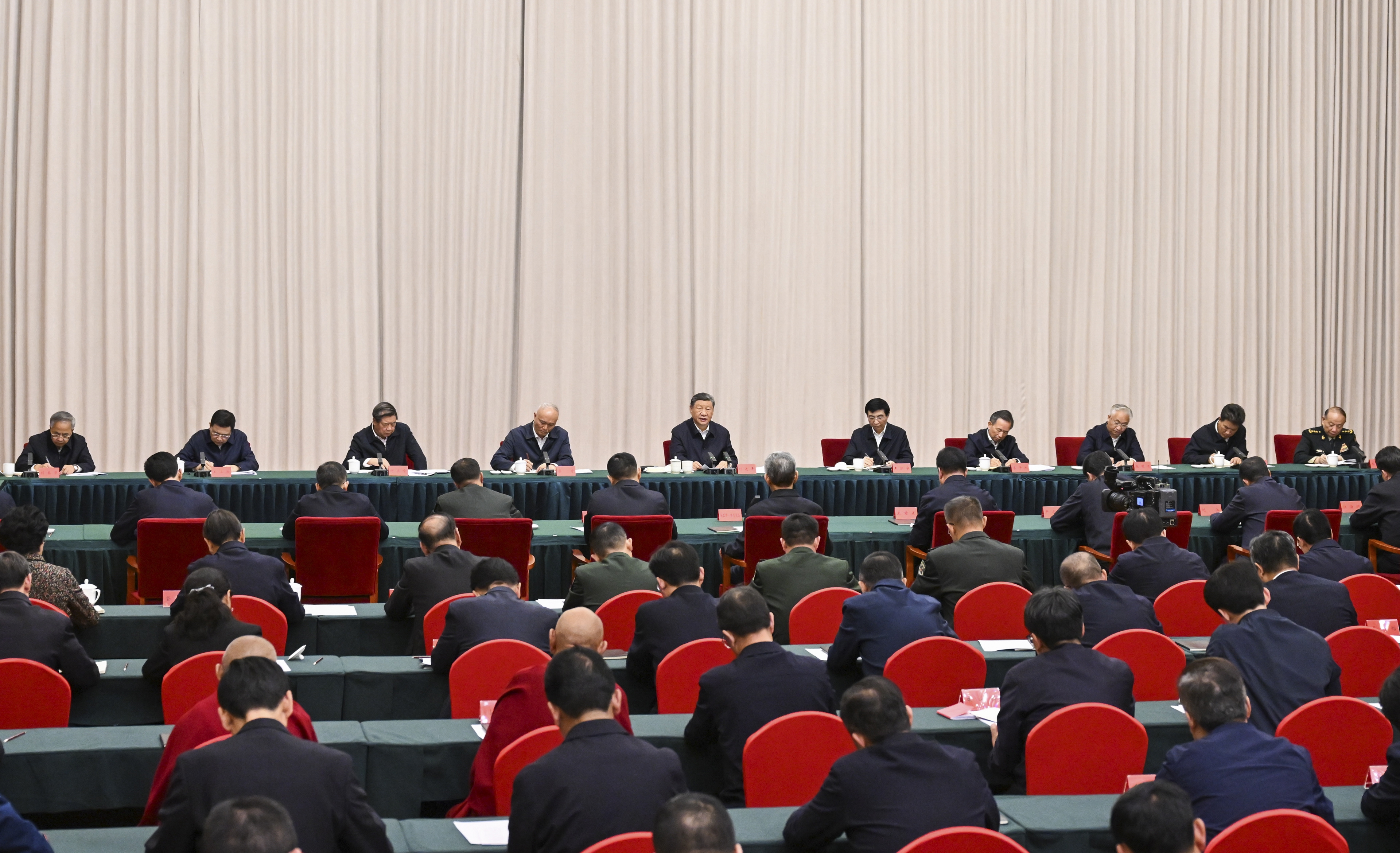 习近平总书记在中共中央政治局常委、全国政协主席、中央代表团团长王沪宁和中共中央政治局常委、中央办公厅主任蔡奇陪同下,健步走上主席台。
