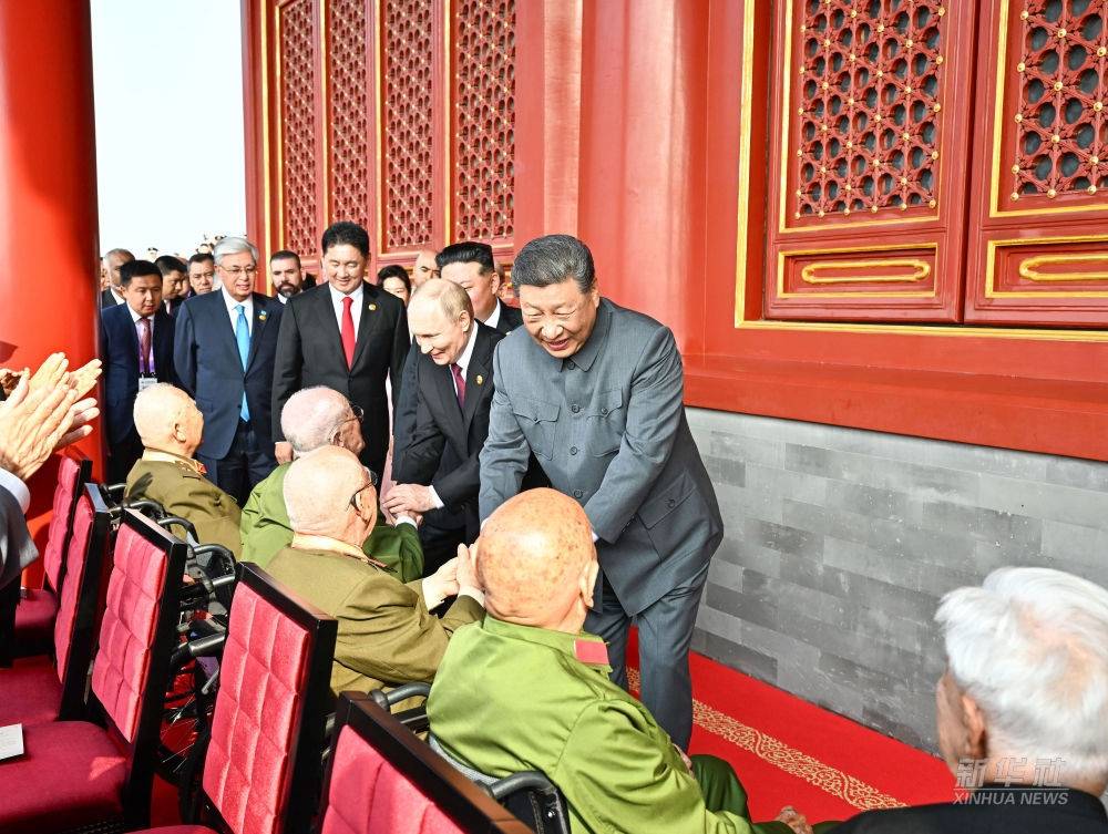 日程:出席纪念中国人民抗日战争暨世界反法西斯战争胜利80周年大会,习近平总书记同抗战老战士老同志亲切握手