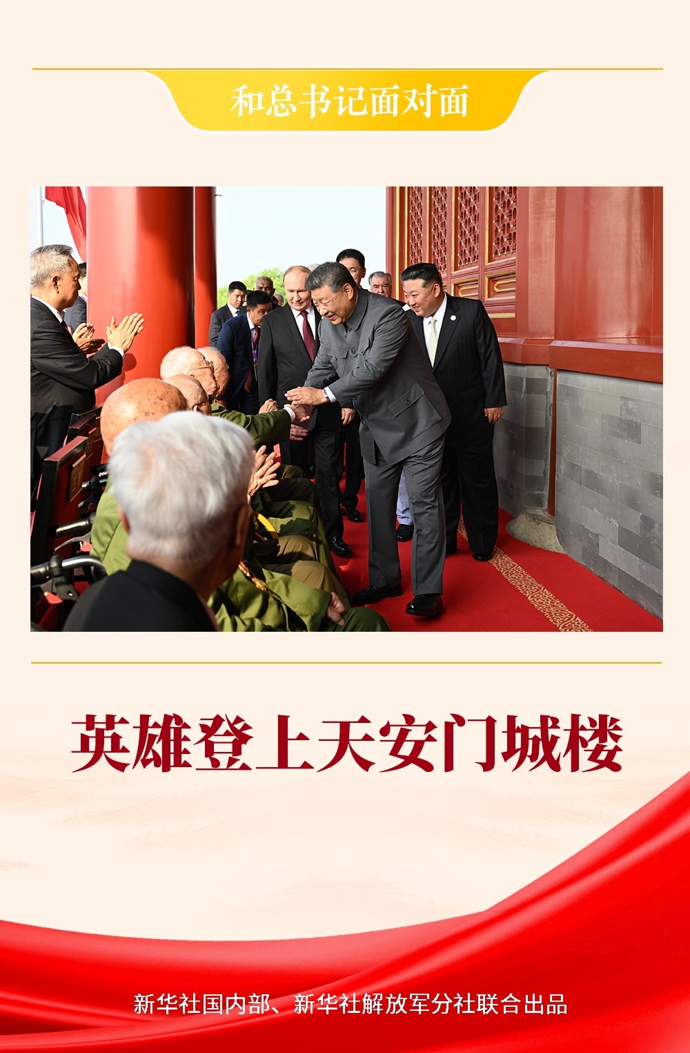 纪念中国人民抗日战争暨世界反法西斯战争胜利80周年大会开始前,习近平总书记登上城楼,走到抗战老战士老同志面前俯下身来,双手紧紧握住他们的手,目光深情而温暖。