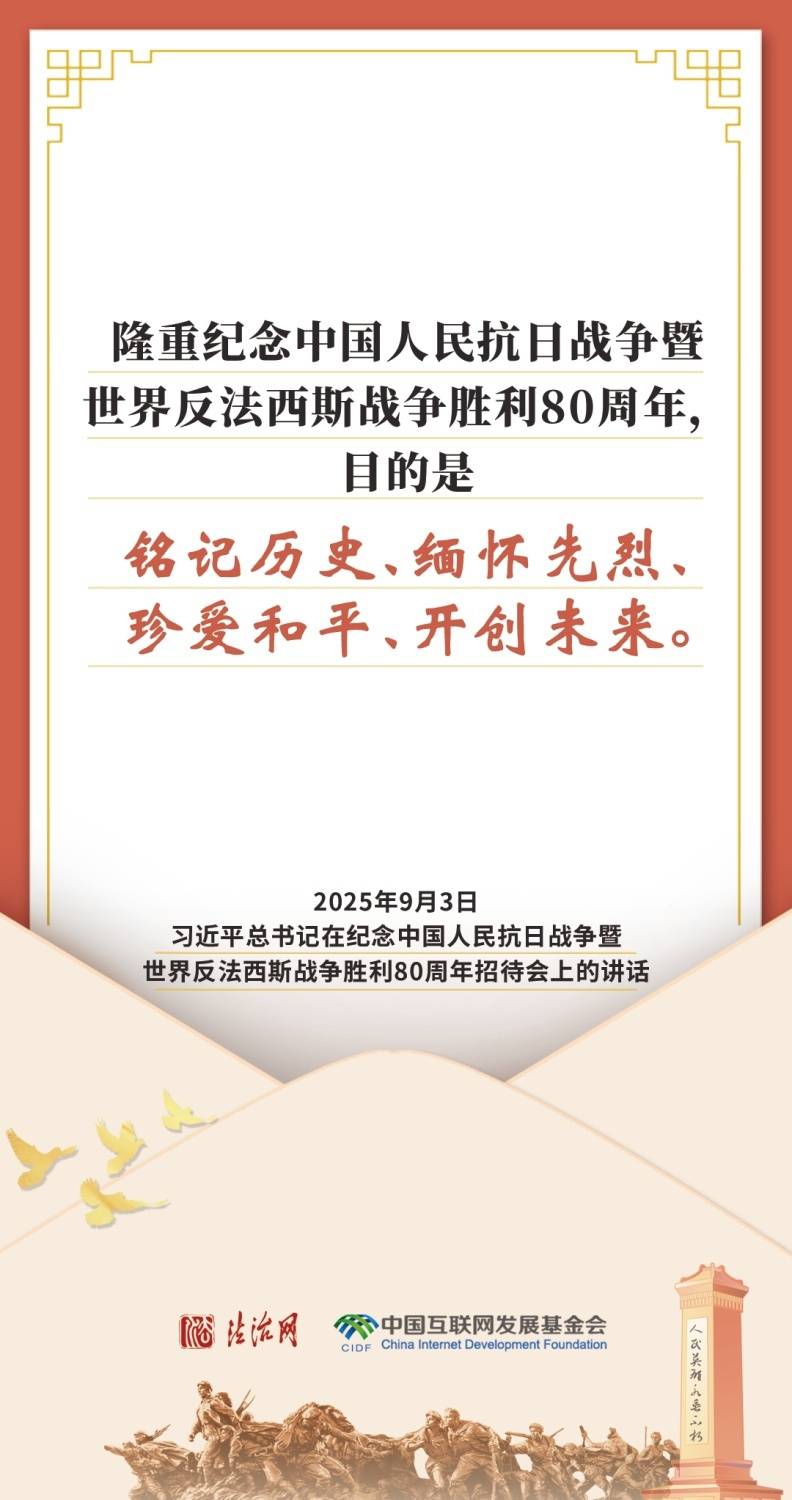 9月3日,习近平总书记在纪念中国人民抗日战争暨世界反法西斯战争胜利80周年招待会上的讲话强调,“隆重纪念中国人民抗日战争暨世界反法西斯战争胜利80周年,目的是铭记历史、缅怀先烈、珍爱和平、开创未来。”