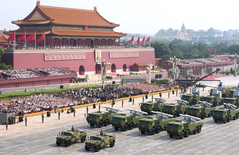 △2025年9月3日,纪念中国人民抗日战争暨世界反法西斯战争胜利80周年大会在北京隆重举行。这是舰载防空武器方队接受检阅。