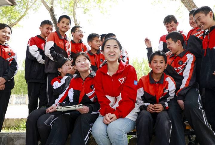 在新疆阿图什市哈拉峻乡谢依特小学,支教教师高淑贤和学生们在一起(2025年4月23日摄)。新华社记者 王菲 摄