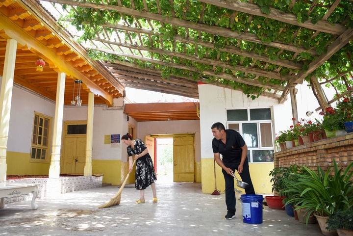 在新疆喀什地区疏附县阿亚格曼干村,村民阿卜都克尤木·肉孜(右)和妻子在打扫庭院(2022年6月10日摄)。新华社记者 丁磊 摄