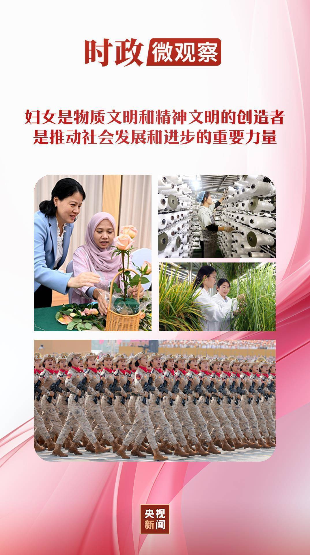 “没有妇女,就没有人类,就没有社会。”“妇女是人类文明的开创者、社会进步的推动者,在各行各业书写着不平凡的成就。”在2015年全球妇女峰会、2020年联合国大会纪念北京世界妇女大会25周年高级别会议等重要场合,习近平主席深刻阐述促进男女平等和妇女全面发展的中国方案与中国主张,充分彰显中国携手各国推进妇女事业发展、推动构建人类命运共同体的真诚愿望和大国担当。