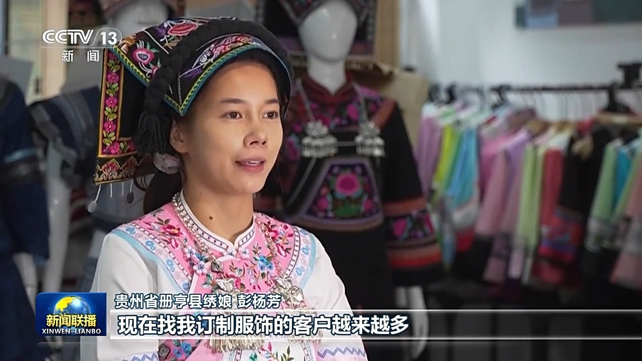 贵州省册亨县绣娘 彭杨芳:现在找我订制服饰的客户越来越多,日子也是越来越好了,过上“背着娃,绣着花,养活自己养活家”的好生活。