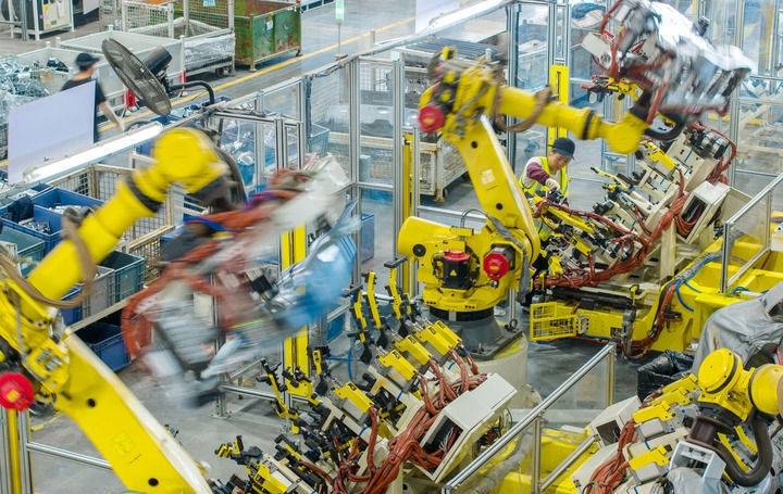2025年10月9日,浙江省湖州市长兴经济技术开发区的长兴地通汽车部件有限公司技术人员操控工业机器人生产新能源汽车配件(无人机照片)。新华社发(谭云俸 摄)