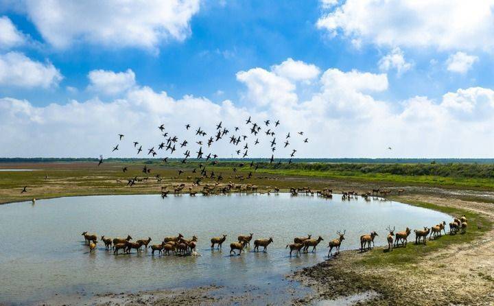 2025年10月11日,在江苏东台条子泥湿地,候鸟飞翔,成群野生麋鹿悠闲散步,一派人与自然和谐共生的生态美景(无人机照片)。新华社发(孙家录 摄)