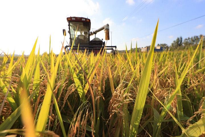 2025年10月16日,在江苏省连云港市赣榆区城头镇中青墩村,种植户驾驶收割机抢收水稻。新华社发(司伟 摄)
