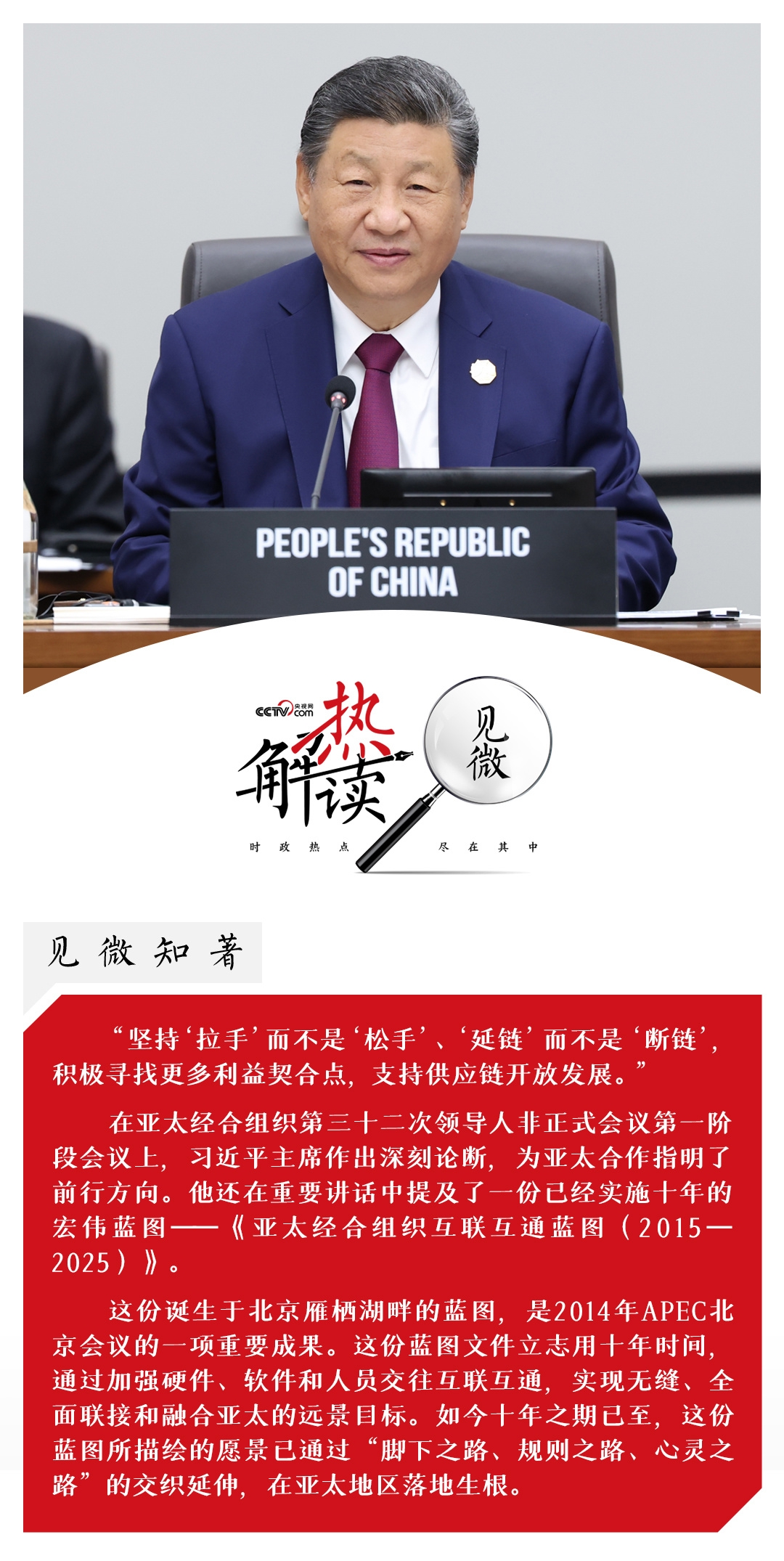 在亚太经合组织这个大家庭里,中国始终以务实行动推动构建互联互通、共同发展的开放格局,让“开放包容”成为亚太合作的主旋律。