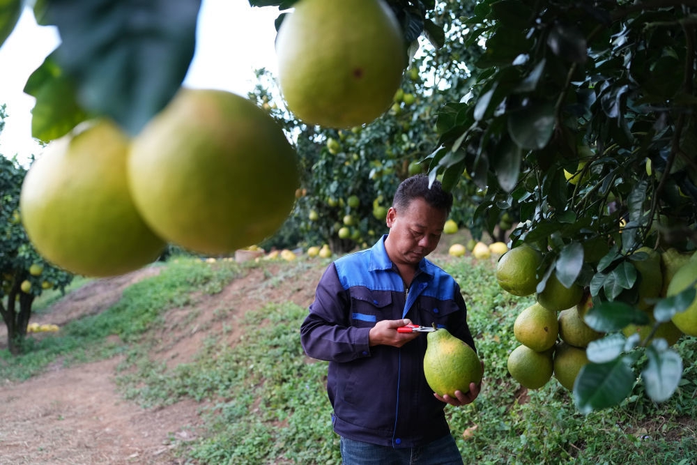 2025年11月7日,柚农在梅州南福金柚种植基地采摘柚子。