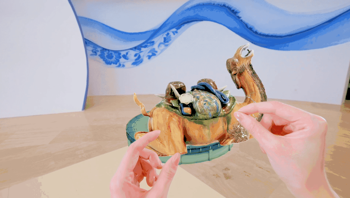 “这款MR眼镜使用的就是3D技术,该技术能够清晰地将文物的纹饰纹样、颜色、形制等信息采集下来。戴上MR眼镜后,观众能够放大缩小、旋转文物,增强了观看体验。”李源说。