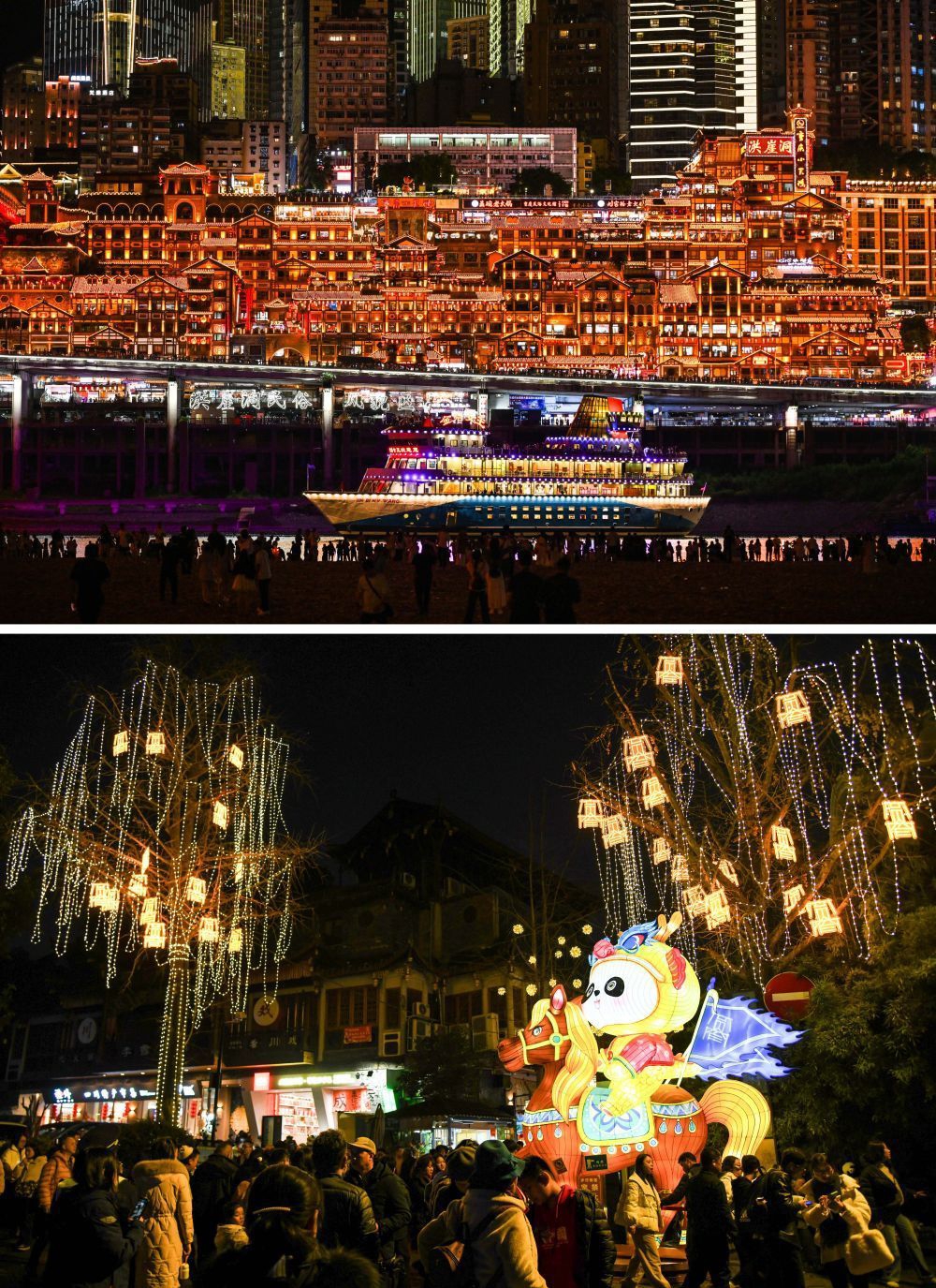上图是游客乘坐游轮观赏重庆洪崖洞夜景(2025年5月28日摄);下图是游客在四川成都宽窄巷子新春光影艺术荟上欣赏彩灯(2024年2月10日摄)。利用特色资源优势,川渝两地推出“宽洪大量”(洪崖洞+宽窄巷子)、“资足常乐”(资阳+大足)等跨区域文旅品牌,以趣味化表达串联双城地标,在社交平台引发“双城打卡”热潮。
