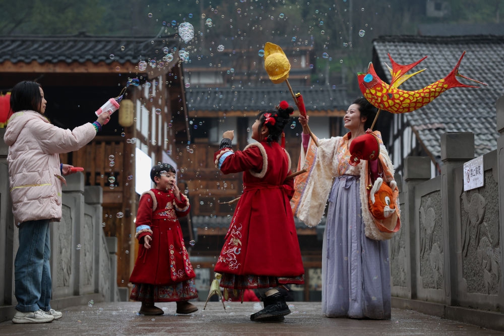 2025年1月24日,游客在四川省广安市武胜县沿口古镇游玩。沿口古镇位于嘉陵江畔,曾是水陆货运繁华、商贾云集的水码头,如今仍较为完整地保存着明清时期城镇格局和古建风貌。