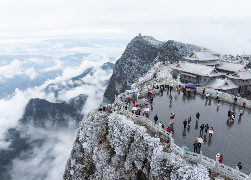 2024年11月20日,游客在峨眉山金顶远眺群峰与云海。四川发挥峨眉山、乐山大佛、大熊猫栖息地等世界遗产资源优势,协同联动乐山、眉山、雅安等地,打造特色旅游产品,推动休闲度假旅游业态升级。