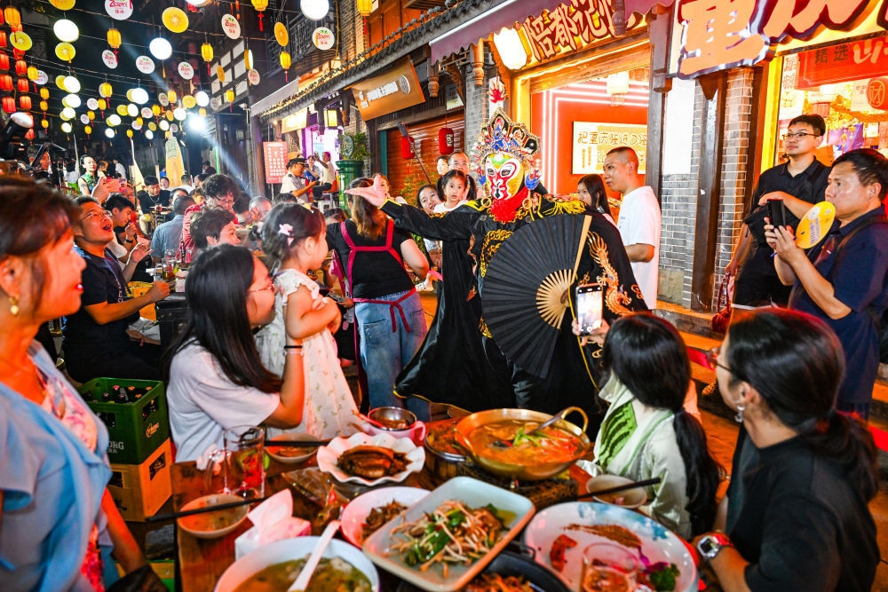 2025年10月5日,川剧变脸演员在重庆磁器口古镇长街宴活动现场与游客互动。作为首批国家级非物质文化遗产,川剧是川渝地区共同的文化名片。2024年,《川剧保护传承条例》出台,规定两地要联合建立川剧保护传承合作机制、川渝川剧名家库和常备剧目、曲目、演出资源库等,通过定期联合举办川剧节、青年演员赛事、联合办学等方式,推动川渝协同开展川剧保护传承。
