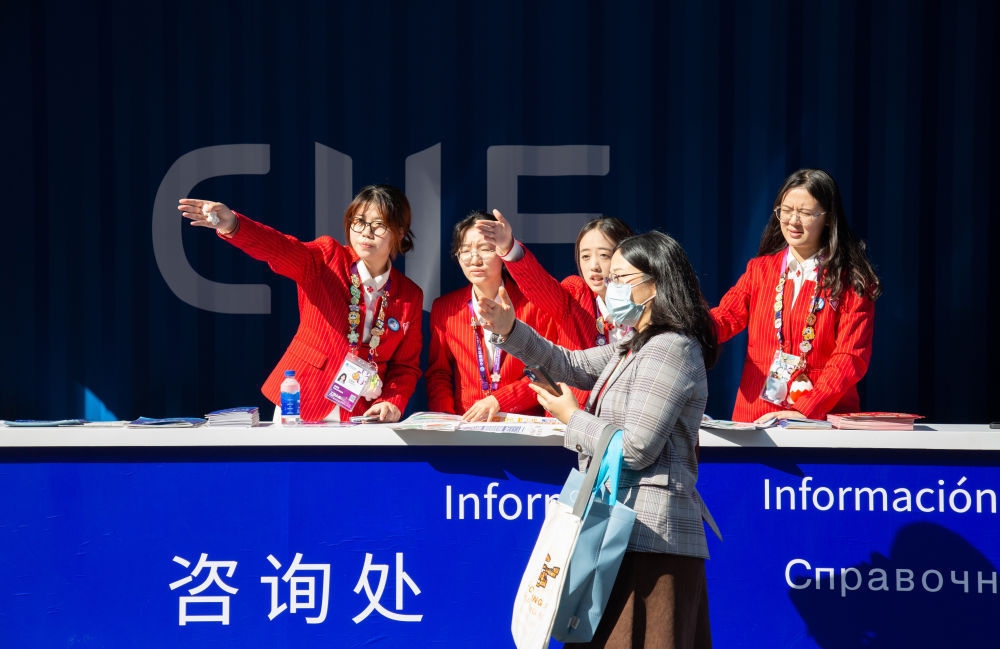 2025年11月10日,第八届中国国际进口博览会闭幕,志愿者为参观者提供咨询服务。第八届进博会共有3865名志愿者“小叶子”,服务于现场引导咨询、展会注册管理、新闻宣传辅助、交易数据统计、医疗卫生辅助等岗位。为提升多语种服务水平,本届进博会志愿者服务保障组首次联合复旦大学、同济大学、上海外国语大学等高校,组建“小语种志愿者联盟”,招募129名志愿者,提供俄语、德语、法语、西班牙语、阿拉伯语、意大利语、葡萄牙语、日语、韩语、泰语等十多个语种服务。