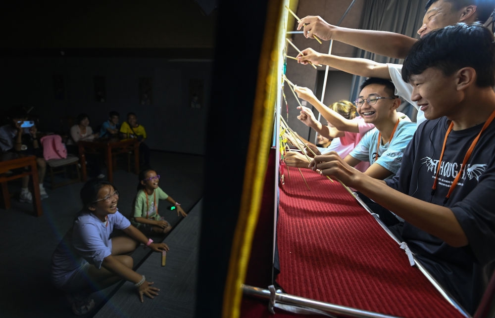 2023年8月8日,进行暑期研学的学生在位于西安的中国秦腔艺术博物馆里体验皮影戏演出。