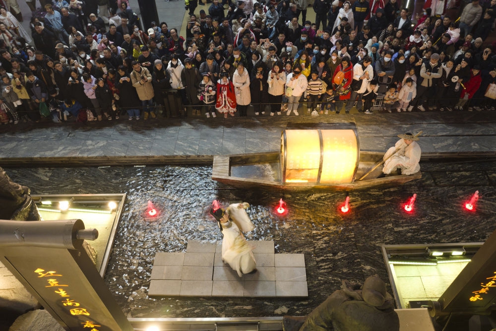游客在西安大唐不夜城景区观看以唐代历史文化为背景创作的情景剧(无人机照片,2025年1月22日摄)。