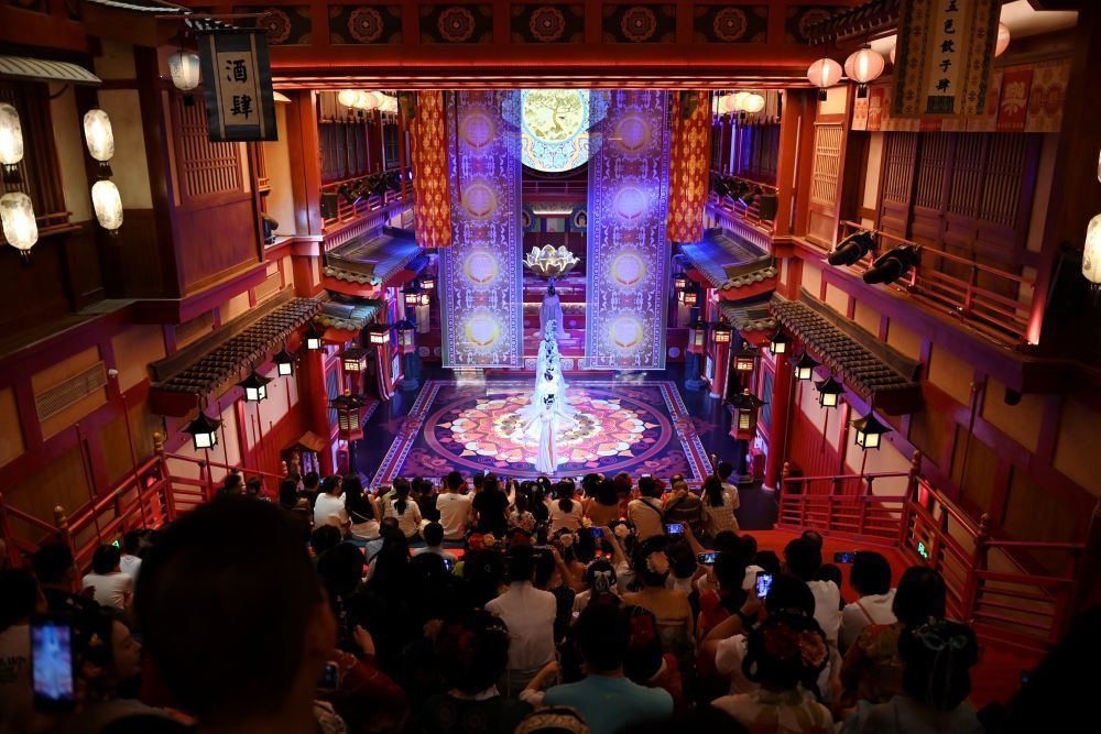 2024年5月12日,游客在西安长安十二时辰主题街区内观看演出。街区通过汉服旅拍、演艺互动、非遗体验等项目,让游客“穿越”回盛唐长安,为游客打造科技感、文化味十足的游历体验。