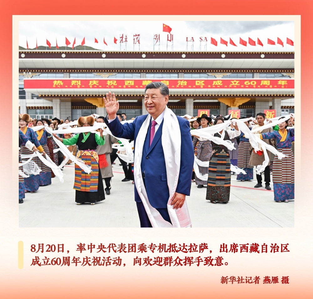 青藏高原,秋风送爽。8月20日,当习近平总书记乘坐的专机在机场降落,等候在停机坪的西藏各族各界群众热烈欢呼起来。习近平作为中共中央总书记、国家主席、中央军委主席率中央代表团到西藏出席西藏自治区成立庆祝活动,这在党和国家历史上是第一次。洁白哈达、切玛和青稞酒、欢快的民族舞蹈、红旗和五彩花束的海洋……各族群众深情表达着对总书记的热烈欢迎与真诚祝福。