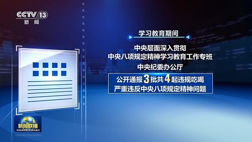学习教育期间,中央层面深入贯彻中央八项规定精神学习教育工作专班、中央纪委办公厅公开通报3批共4起违规吃喝严重违反中央八项规定精神问题,形成强大震慑。
